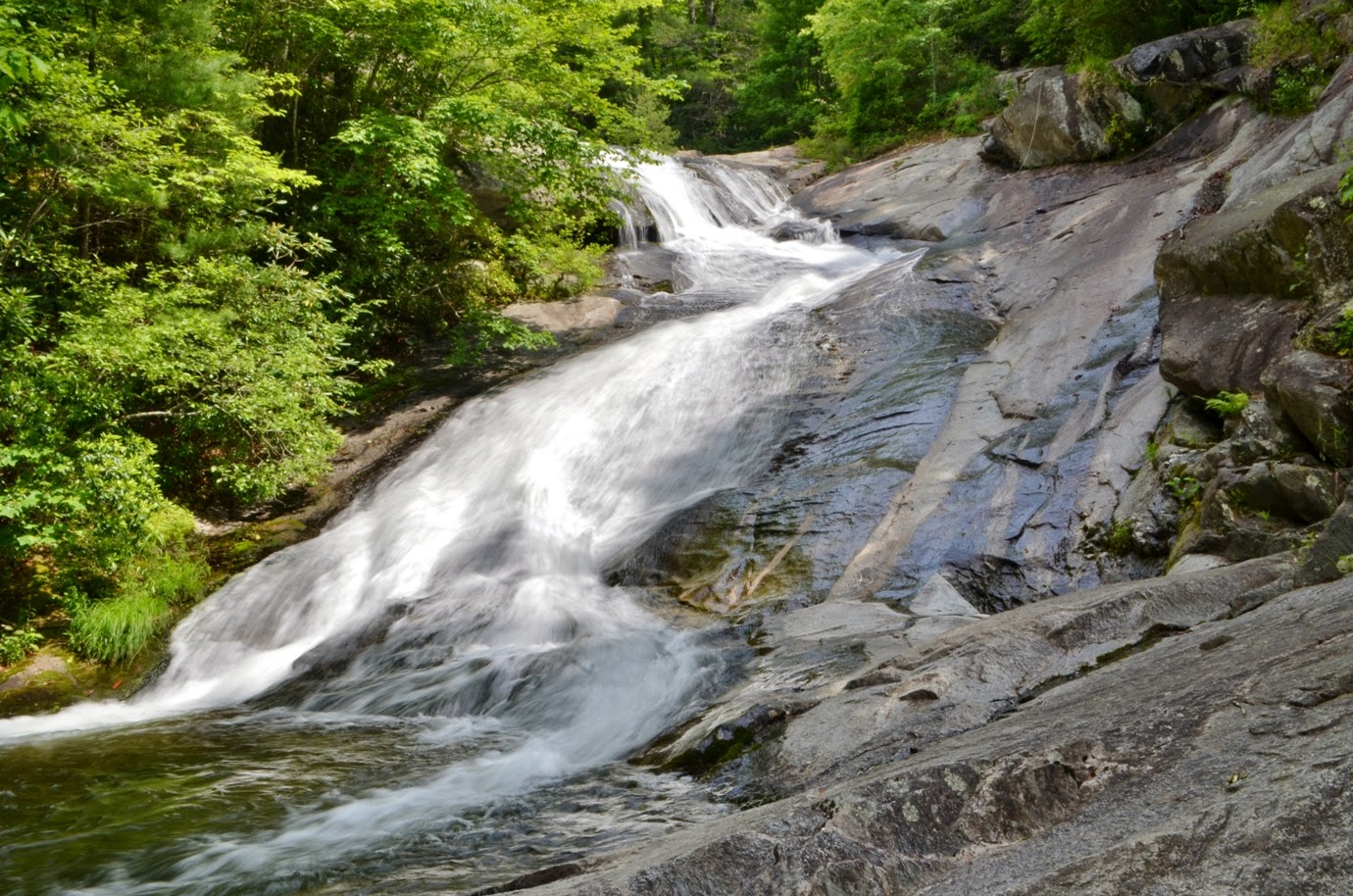 There were three creek crossings between the trailhead and the waterfall, but we had no trouble getting across by rock hopping. At the top of the waterfall, some rhododendron were blooming and butterflies danced about the blooms.