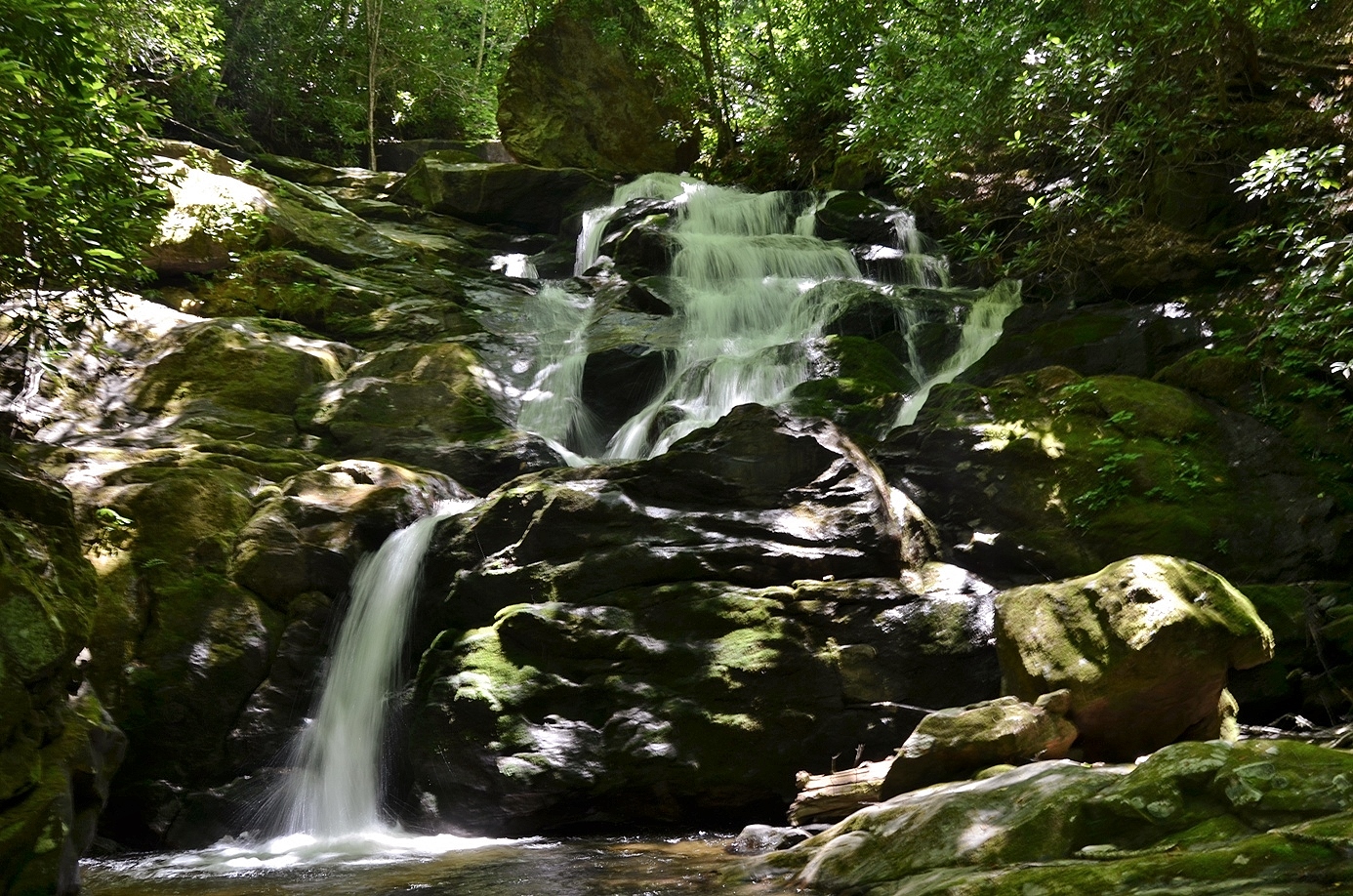 By 11, I was heading back to the car. I drove north back towards Cullowhee and turned right on Caney Fork Road. I was originally planning to head to the waterfalls on Sugar Creek, but the road condition wasn’t great and I didn’t know if I could make it in my Corolla. So I continued on a little further on Caney Fork Road and parked right after the road changed to gravel. I got my stuff together and backtracked a short ways on the road and turned left on Rough Butt Road, a small gravel drive. In less than a quarter-mile, the road comes to a crossing of Caney Fork. There used to be a bridge, but it washed away in a storm. I forded the creek here and continued following the old road (FSR-4669) up along a ridge over Caney Fork. Shortly, the road curved to the right and came to a crossing of Rough Butt Creek. I forded again here and climbed up a steep bank on the opposite side. There was a faint path following Rough Butt Creek upstream to the waterfall. This waterfall is not real high, but was very scenic, even in low water.