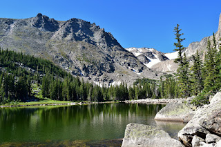 The lighting was terrible with the sun shining right on it - bad for pictures and it was hard to look at with the glare. It's a popular area and crowded so we didn't stay long. The trail made another switchback away from Fern Creek over to the Spruce Creek drainage and then followed the ridge between the two. After the confluence with Big Thompson River, there were some nice cascades along the river.