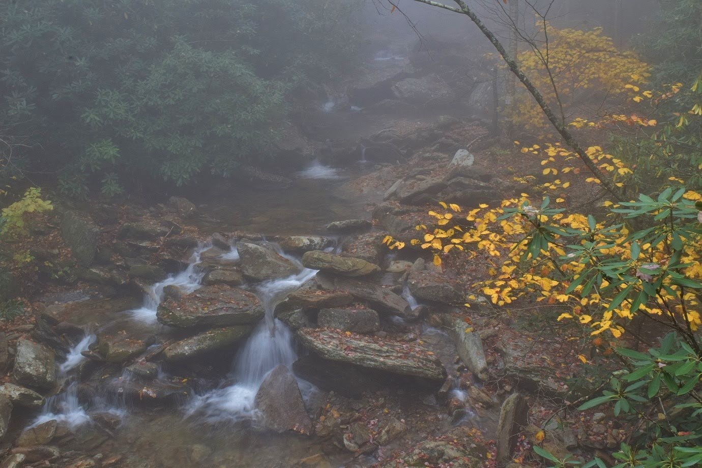 It was a perfect view from here and the parking area was full, so I was not the only one who woke up early for a beautiful sunrise. I continued on to Julian Price Memorial Park and parked at the picnic area. After getting my stuff together, I set out on Boone Fork Trail, going right to hike the loop counterclockwise. The trail followed Boone Fork downstream and there was some nice fall color showing despite the foggy weather. A little over a mile, the Mountains to Sea Trail crossed the creek on a new footbridge.