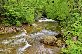 The road curved around and crossed Toms Spring Branch again below the upper waterfall.