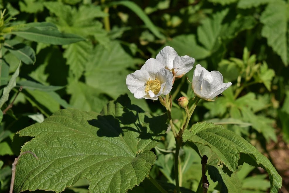 Thimbleberry (Rubus parviflorus) produces edible berries similar to raspberries.
