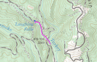 Hike down the right gated road to a crossing of South Prong Turkey Creek. I was able to rock hop in low water but it might be tough in high water. Right after the crossing, turn left on a more overgrown road following the creek upstream. Go about a quarter mile and you can hear the waterfall and maybe see it through the trees. There's no real trail to the base and it's steep, but you can follow a path that others have used.
