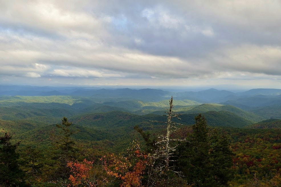 Continue straight to reach the north-facing overlook. Looking back towards the parkway, Grandfather Mountain is visible towering over the road. Looking east, there are views of the Piedmont.